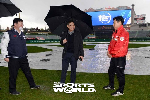 [SW포토]2018한국시리즈 4차전 우천순연 기사입력 2018-11-08 16:05:55 기사수정 2018-11-08 16:05:56 글씨 크기 선택 가장 작은 크기 글자 한 단계 작은 크기 글자 기본 크기 글자 한 단계 큰 크기 글자 가장 큰 크기 글자 [스포츠월드 김두홍 기자]한대화 경기 감독관(가운데)이 8일 인천 SK행복드림구장에서 열릴 예정인 '2018 한국시리즈' 두산과 SK의 4차전에 양팀 관계자와 함께 우천순연 결정을 하고 있다. 인천=김두홍 기자 kimdh@sportsworldi.com 2018.11.08. [ⓒ 세계비즈앤스포츠월드 & sportsworldi.com, 무단전재 및 재배포 금지] 메뉴보기 페이스북 공유 트위터 공유 url 공유 더보기