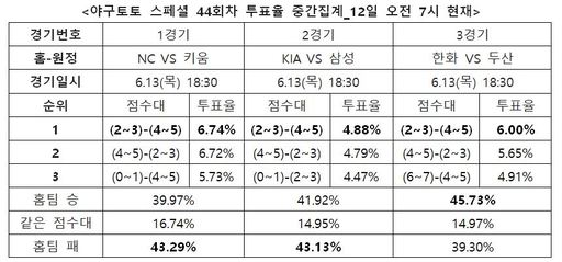 이번 야구토토 스페셜 44회차 게임은 경기 시작 10분 전인 오는 13일 오후 6시 20분 발매가 마감되며, 경기가 모두 종료된 후에 적중결과가 공식 발표된다.