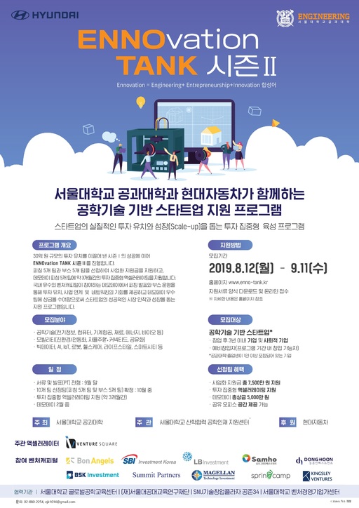 [이재현 기자]현대자동차는 현대자동차가 후원하고 서울대 공과대학이 주관하는 기술 스타트업 아이디어의 사업화와 성장을 지원하는 엑셀러레이팅 프로그램 '에노탱크 시즌2'를 개최한다고 12일 밝혔다.