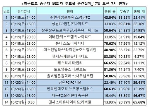 한편, 이번 승무패 35회차는 오는 19일 오후 1시 50분에 발매를 마감하며, 경기가 모두 종료된 후에 결과가 공식 발표된다.