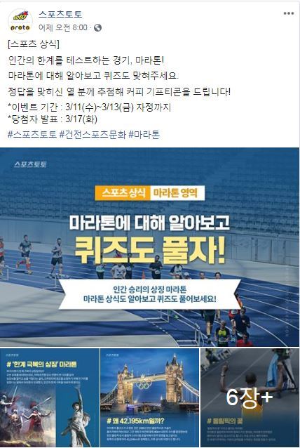 체육진흥투표권 스포츠토토의 수탁사업자인 ㈜케이토토가 공식 페이스북을 통해 오는 13일(금) 자정까지 마라톤과 관련 퀴즈를 맞히는 ‘스포츠상식’ 이벤트를 실시한다고 밝혔다.