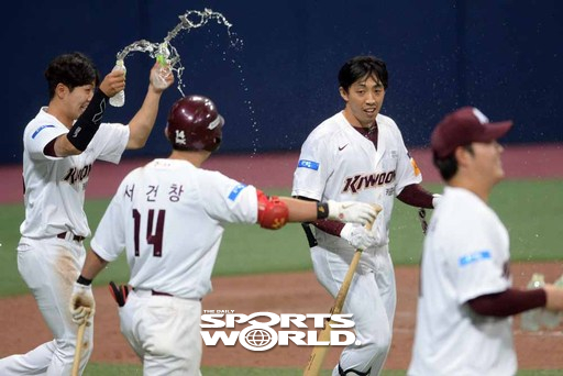 [스포츠월드 김두홍 기자]프로야구 키움 박정음(오른쪽에서 두번째)이 21일 고척스카이돔구장에서 열린 SK와의 경기 연장 10회말 무사 2루때 끝내기 적시타를 때린 뒤 동료들의 축하를 받고 있다. 고척=김두홍 기자 kimdh@sportsworldi.com 2020.05.21.