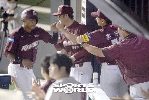 [스포츠월드 김두홍 기자]프로야구 키움 러셀(왼쪽)이 28일 잠실구장에서 열린 두산과의 경기 6회초 1사 만루 김혜성의 희생플라이아웃때 득점하며 손혁 감독의 축하를 받고 있다. 잠실=김두홍 기자 kimdh@sportsworldi.com 2020.07.28.