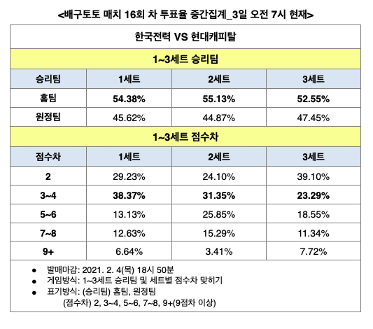 1~3세트 승리팀과 점수차를 맞히는 배구토토 매치 16회차 게임에서 1~3 세트별 예상 승리팀은 모두 홈팀인 한국전력의 차지로 돌아갔다.