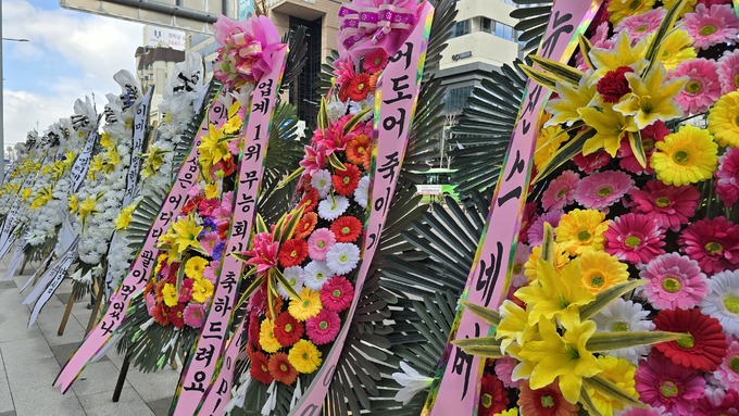 서울 용산 하이브 사옥 앞에 근조화환이 깔렸다.