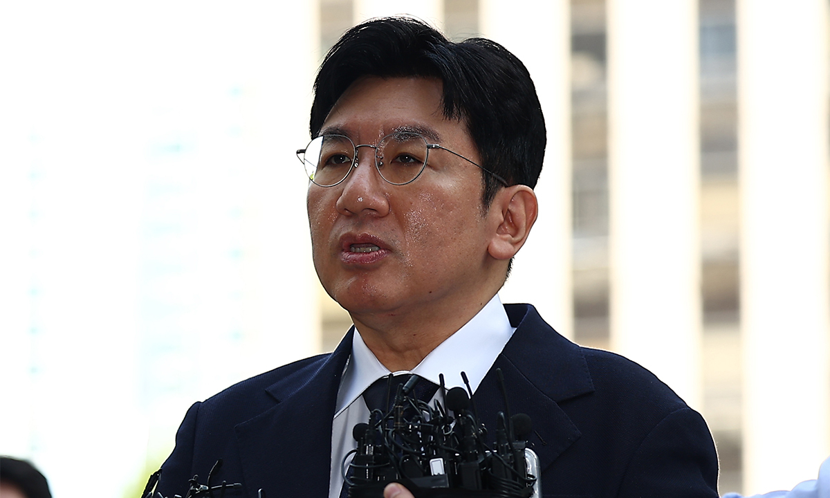 방시혁 하이브 의장이 15일 오전 서울 마포구에 위치한 서울경찰청 광역수사단 금융범죄수사대에 출석했다.