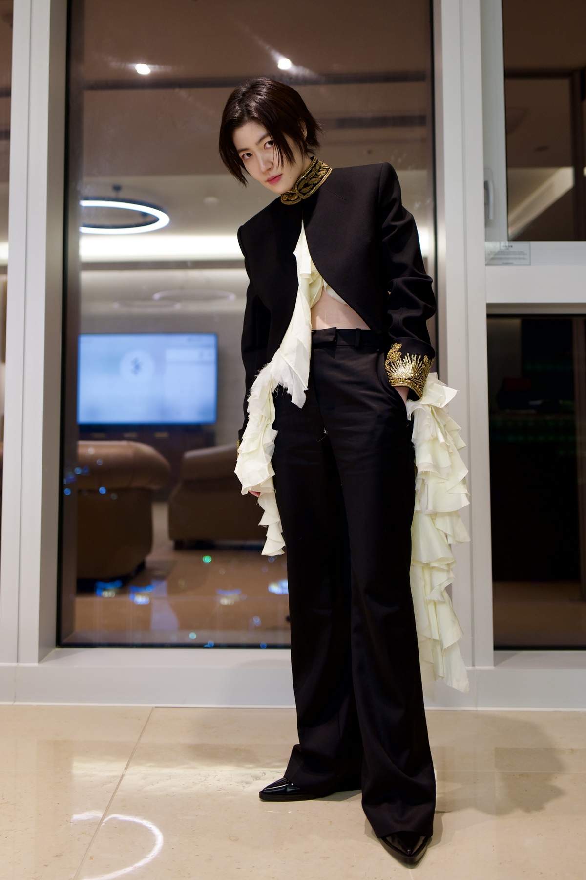 심은경은 아이보리 컬러 실크 조젯 소재의 오이스터 러플 탑에 골드워크 보더 엠브로이더리 재킷과 울 개버딘 테일러드 팬츠를 더해 멋스러운 수트 패션을 선보였다.