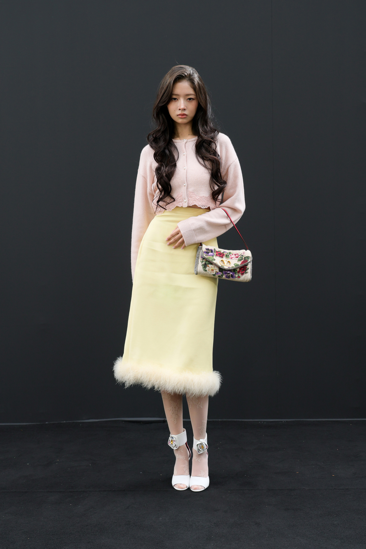 레이는 로맨틱한 레이스 디테일의 가디건과 크레이프 소재의 스커트, 로즈 디테일이 포인트인 드립 로즈 샌들에 발렌티노 가라바니 소프트 베인 백을 더해 부드러우면서도 우아한 아름다움을 자랑했다.
