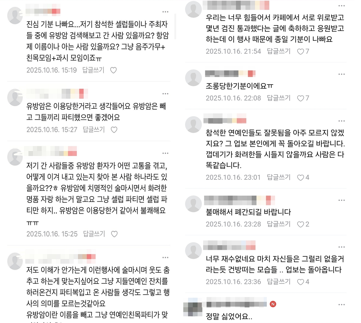 당사자인 유방암 환자들의 반응은 어떨까. 멤버 수 약 19만명의 유방암 환자 커뮤니티에서도 “유방암은 빼고 그들끼리 파티했으면 좋겠다”, “유방암은 이용당한 것 같아서 불쾌하다”, “너무 힘들어서 서로 위로받고 몇년 검진 통과했다는 글에 축하하고 응원받고 하는데 이 행사 때문에 종일 기분이 나쁘다” 등 모욕감을 드러내고 있다. 유방암을 겪지 않은 이들도 황당할 수 밖에 없는데 당연히 당사자들에게는 더욱 큰 상처로 남을 법 하다.