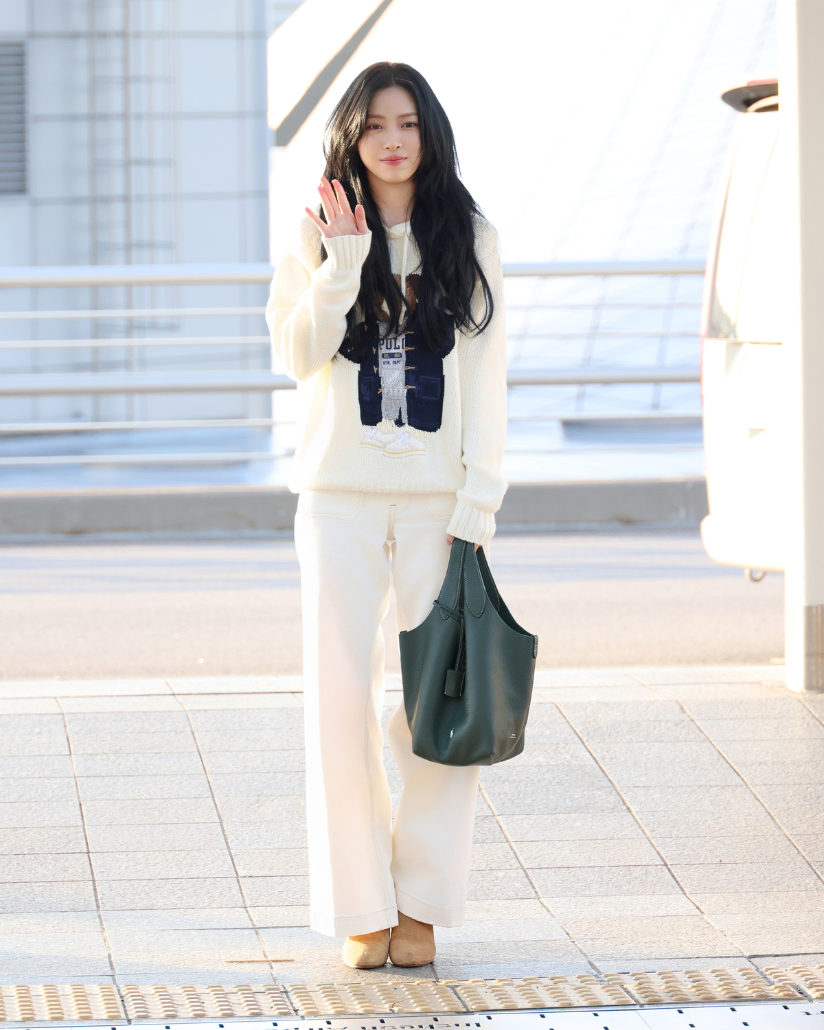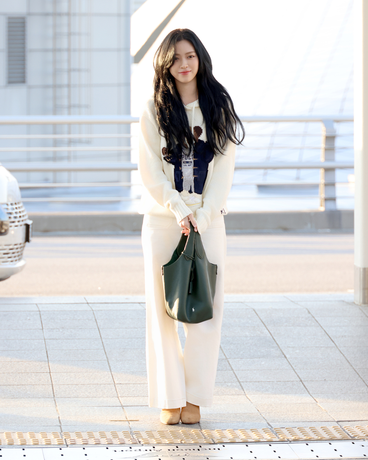 류진은 빈티지 스타일의 폴로 베어 디테일이 돋보이는 코튼 리넨 니트 후디와 깔끔한 화이트 컬러의 와이드 레그 치노 팬츠를 착용해 캐주얼하면서도 편안한 공항패션을 선보였다. 여기에 폴로 랄프 로렌의 폴로 플레이 레더 토트백과 웨스턴 부츠를 매치해 멋스러운 무드를 더했다.