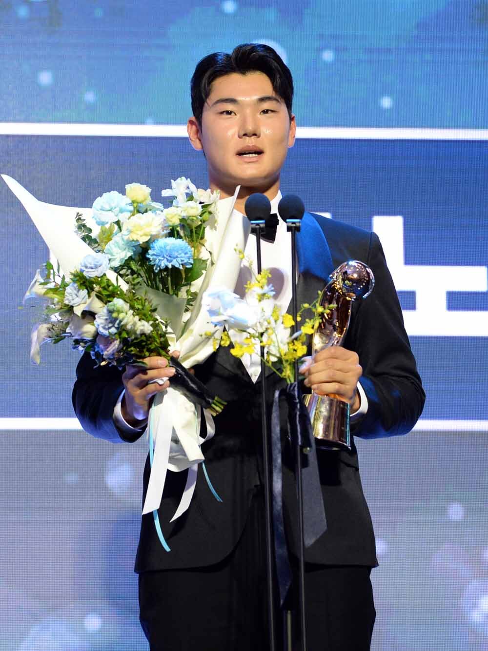 프로야구 NC 김주원이 24일 서울 송파구 잠실 롯데호텔 월드 크리스탈볼룸에서 열린 '2025 신한 SOL뱅크 KBO 시상식'에서 수비상을 수상한 뒤 소감을 발표하고 있다. 사진=김두홍 기자 kimdh@sportsworldi.com
