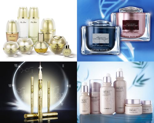 | LG생활건강의 '오휘 더 퍼스트', 네이처리퍼블릭의 '어드밴스드 셀부스팅 스템셀 데이 나이트크림', 더페이스샵의 '마린 스템셀 셀 리프팅', 이지함화장품의 '닥터스 케어 셀 리페어 라인'(왼쪽으로부터 시계방향으로) |