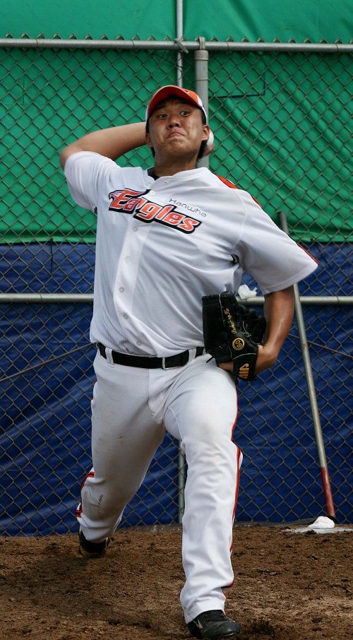 ‘메이저리그 120승’ 투수 박찬호(37)가 감탄성을 토해냈다. 하와이 오하우구장 구석에 마련된 불펜에서 프로야구 한화의 장신 우완투수가 던지는 공을 지켜본 뒤다. 직구는 몹시 꿈틀거리며 불펜 포수가 요구한 위치에 꽂혔고, 체인지업은 홈플레이트에 꽂힐 듯 떨어졌다.