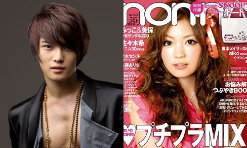 | 일본 인기 모델과 열애설에 휩싸인 영웅재중(왼쪽)과 야노 미키코가 표지를 장식한 일본 논노 잡지. |