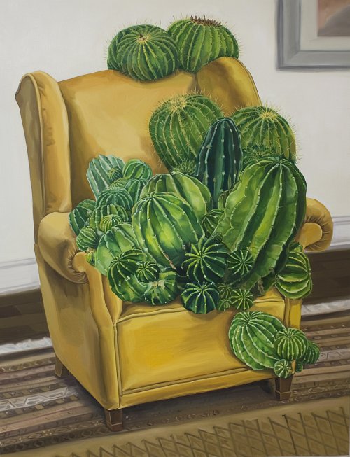 일인용 쇼파 위에 놓여 있는 각양각색의 선인장이 그려져 있는 ‘I CAN’T HEAR YOU’ 작품은 선인장만 해도 여러 종류가 있고 같은 종류라도 또 그 크기와 빛깔이 조금씩 다른 것처럼 인간 또한 비슷하게 생겼음에도 때론 대화가 통하지 않고 가시돋힌 말들을 던지며 상처를 주는 인간이라는 동물을 떠올리며 상상의 나래를 펼친 결과다.