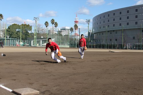 | SK 3루수 최정(앞쪽)과 2루수 정근우가 18일 일본 고치시영구장의 스프링캠프에서 강도높은 내야수비 펑고훈련을 받고 있다. SK 와이번스 제공 |