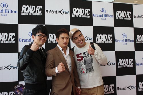 | 정문홍 로드FC 대표가 지난 4월16일 서울 홍은동 그랜드힐튼 호텔에서 열린 '로드FC 002 ALIVE!' 대회 시작 전 대회장을 찾은 개그맨 윤형빈, 김지호 등과 포즈를 취하고 있다. 사진=로드FC 제공 |