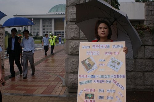 이날 서성금은 애완견 진료비와 성형수술 부가세에 대한 반대의견을 펼치며 피켓을 들고 1인 시위를 펼쳤다. 서성금은 먼저 애완견 진료비에 있어서는 “최근 애완견이라는 말보다는 반려견이라는 말을 쓰는 것처럼 이젠 동물이 아닌 한 가족의 일원으로 받아 들여지는 반려견에 대한 진료비 10% 부가는 서민들을 울상 짓게 하는 세금”이라고 주장했다.