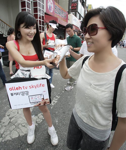 | KT는 17, 18일 서울 곳곳에서 올레TV스카이라이프의 최다 볼거리를 상징화 한 ‘볼거리 빵빵’ 스낵을 나눠주는 행사를 실시했다. 사진은 17일 강남 센트럴 시티 야외광장에서 KT 홈고객부문 서유열 사장이 시민들에게 '볼거리 빵빵' 스낵을 나눠주고 있는 모습. |