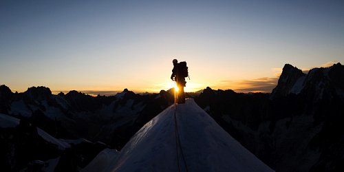 | 한 산악인이 산 정상에서 해를 맞고 있다. |