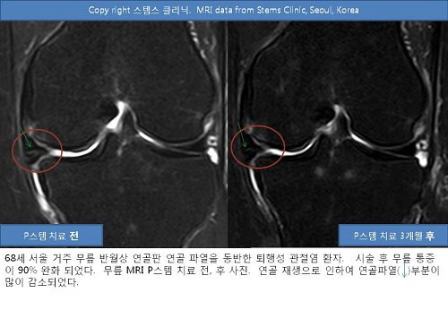 박 원장은 이 같은 치료 조성물을 퇴행성관절염 환자와 대퇴골두무혈성괴사증 환자에게 네 차례에 걸쳐 주사하고 자기공명영상촬영(MRI)으로 관찰한 결과, 새로운 반월상연골판 연골조직, 유리성 연골조직, 골두조직(뼈)의 형성을 확인했다고 설명했다.