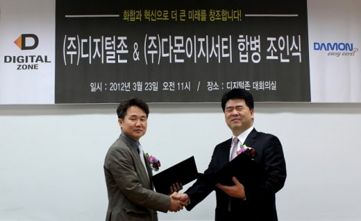 | 심상원 디지털존 대표(왼쪽)와 전정우 다몬이지서티 대표가 기업 합병 조인식을 가진 뒤, 악수하고 있다. 디지털존 제공 |
