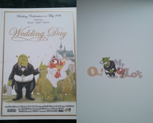 공개된 정준하의 청첩장에는 만화영화 캐릭터 슈렉과 니모의 모습이 담겨있어 눈길을 끈다. ‘5월 20일 결혼행사(Wedding Celebration on May 20th)’라는 문구 아래 턱시도를 입은 슈렉과 웨딩드레스를 입은 니모가 손을 맞잡고 있는 그림이다. 슈렉과 니모는 평소 정준하와 그의 예비신부가 서로를 부르는 애칭인 것으로 알려졌다.