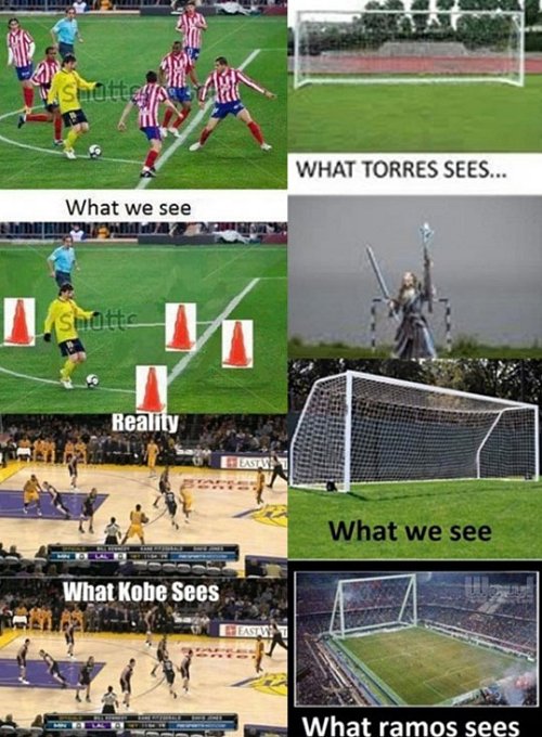 이어 페르난도 토레스에게는 축구 골대가 핸드볼 골대처럼 작아 보이는 것 같고, 라모스가 느끼기에는 골대가 관중석 2층만큼 높아 보인다고 꼬집고 있다.