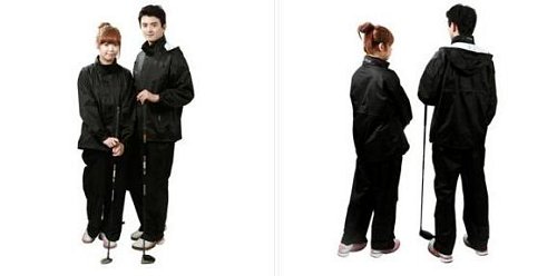 상의 앞 뒤 트임 및 무릎 트임은 우비를 보다 쾌적하게 입을 수 있도록 해 주며 손목에 달린 찍찍이와 바지 밑단의 벨크로 테이프는 비를 효과적으로 막아주는 역할을 한다.