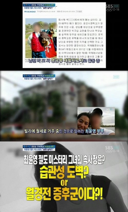 또 이날 방송에서는 앞서 무직 상태로 알려졌던 최윤영 남편의 직업이 맹금류 재활치료사인 사실이 밝혀졌다. 남편 박모씨는 해외 유학파 출신으로 현재 국제매사냥협회 한국 대표로 활동하고 있다.