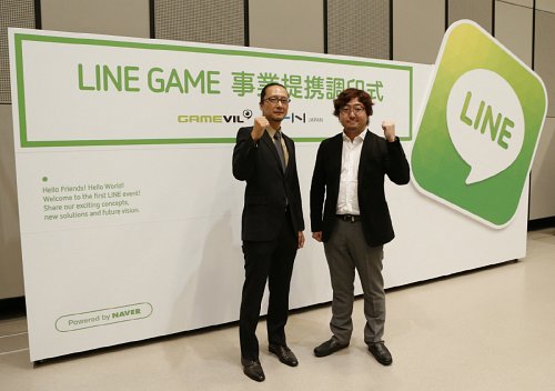 | 게임빌이 NHN 재팬의 모바일 메신저 서비스 '라인'을 통해 해외 시장에 진출한다. 사진은 NHN 재팬과 게임빌의 사업 제휴 모습. 왼쪽부터 나종구 게임빌 재팬 지사장, 모리카와 아키라 NHN 재팬 대표 |