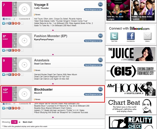 싸이의 ‘강남스타일’이 숱한 화제를 낳으며 전 세계 각 곳에서 1위를 차지함은 물론, 5주 연속 빌보드 메인 차트에서 2위를 수성중인 때에, 역시 미주에서 별다른 활동이나 프로모션이 없었던 블락비가 첫 정규앨범 ‘BLOCKBUSTER’를 10위에 안착시킴으로써 이들을 비롯한 신예들이 분위기를 이어받아 빌보드에서 본격적으로 돌풍을 일으킬지 귀추가 주목되고 있다.