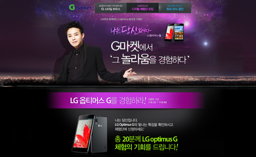 우선, 오는 11일까지 LG 스마트폰 ‘옵티머스G’ 디지털 체험단을 모집한다. 이벤트 페이지에 이름·나이·연락처·블로그 주소·신청 이유 등을 올리면 된다. ‘옵티머스G’ 정상 개통(LG유플러스)이 가능하고, 개인 블로그가 있는 G마켓 회원이면 누구나 신청할 수 있다. 체험단은 ‘옵티머스G’를 직접 체험하고, 체험단 카페 및 개인 블로그를 통해 이용후기를 작성하면 된다. 이용 후기를 올린 체험단 중 20명을 선정해, ‘옵티머스G’를 지급할 예정이다.