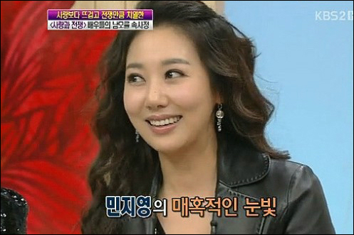 민지영은 13일 오전 방송된 KBS 2TV `여유만만`에 출연해 그간 KBS2 `부부클리닉 사랑과 전쟁2`(이하 사랑과 전쟁) 촬영 에피소드를 전했다. 그는 이날 극 중 베드신 연기에 대해 "수많은 남자들과 같은 침대를 쓰다 보니 (연기가)자연스러워 진 것"이라고 설명했다.