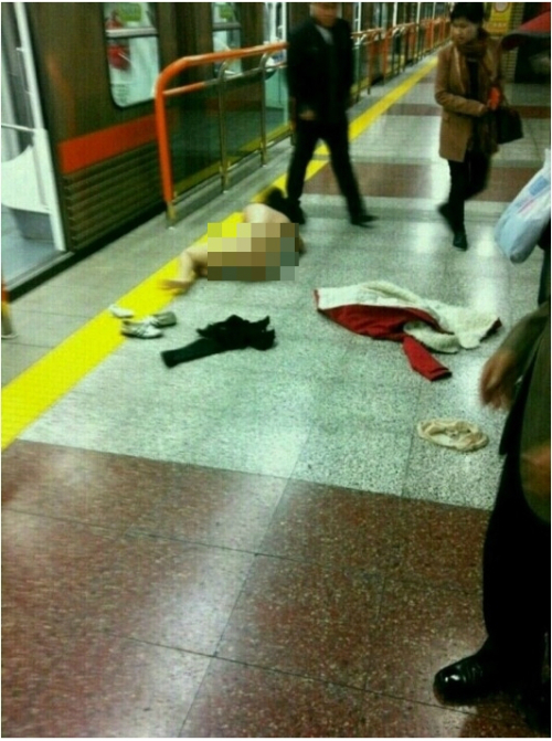 사진에는 지하철 승강장에서 한 여성이 겉옷은 물론 속옷까지 모두 벗은 채 엎드려 있는 모습이 담겨 있으며 여성의 주변에는 코트와 바지 신발 속옷 등이 널려져 있다.
