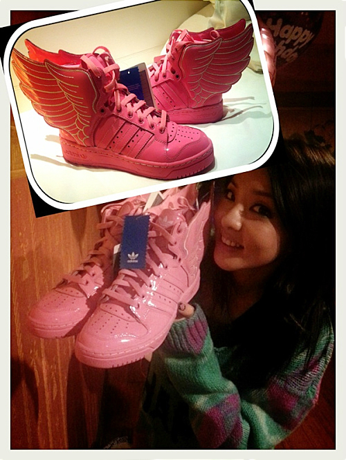 공개된 사진 속 산다라박은 패션 디자이너 제레미 스캇에게 선물받은 날개 운동화를 들고 환히 웃으며 행복한 모습을 보였다.