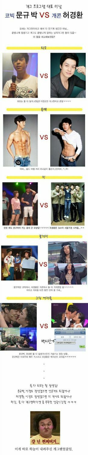 이 커뮤니티의 게시판에는 `개그 프로그램 대표 미남 코빅 문규박 VS 개콘 허경환`이라는 제목의 사진에는 외모부터 몸매, 키, 꽃거지, 함께해 왔던 여자 파트너들까지 차례대로 비교 되 있어 보는 이들의 웃음을 자아내고 있다.