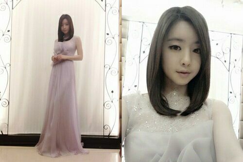 사진 속 홍수아는 차분한 단발머리에 연보라색 롱 드레스를 입고 카메라를 바라보며 포즈를 취하고 있다.