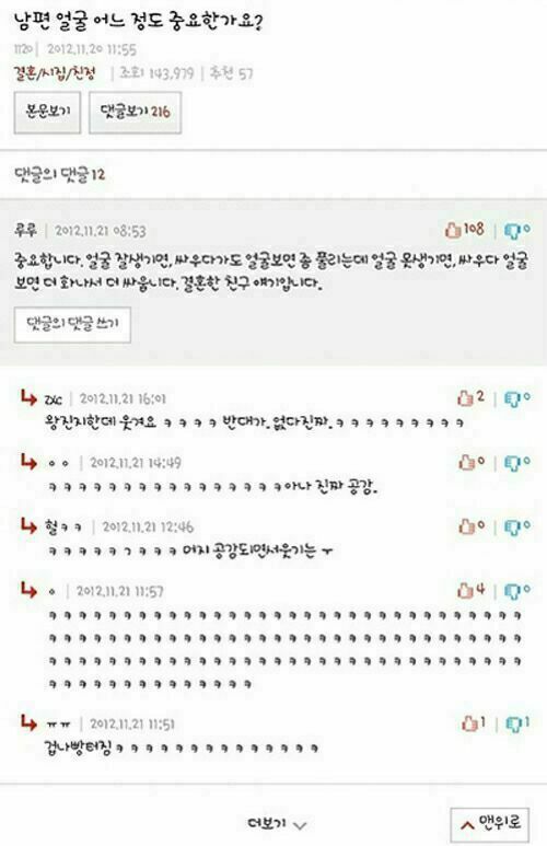 답변에는 "중요합니다. 얼굴 잘생기면 싸우다가도 얼굴 보면 좀 풀리는데 얼굴 못생기면 싸우다 얼굴 보면 더 화나서 더 싸웁니다. 결혼한 친구 얘기입니다"라고 적혀있다.