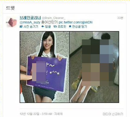 지난 23일 온라인 커뮤니티에는 `한 네티즌이 수지 트윗에 보낸 성추행 사진`이라는 제목으로 수지를 성적으로 희화한 게시물이 올라와 충격을 안겨주고 있다.