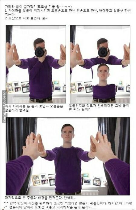 `카메라 없이 셀카 찍기` 사진을 접한 누리꾼들은 "나도 한 번 해봐야겠다" "포토샵 못하는 사람은 어쩌라고" "역시 포토샵은 위대해" 등 다양한 반응을 보였다.