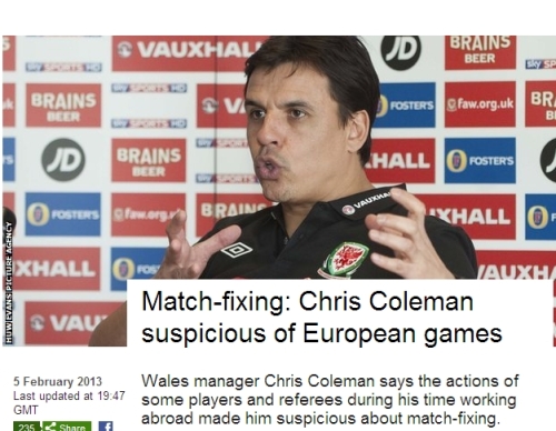 크리스 콜먼 웨일스 국가대표팀 감독은 6일(한국시간) 영국 공영방송 BBC와의 인터뷰에서 “몇몇 선수와 심판이 승부조작과 관련해 의심스러운 행동을 하는 것을 봤다”고 증언했다. 스완지시티 출신은 콜먼 감독은 풀럼을 시작으로 레알 소시에다드(스페인), 코벤트리 시티(잉글랜드), 라리사(그리스)를 거치며 지도자 생활을 했다.