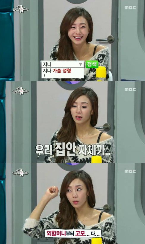 이날 방송에서 지나는 "내 연관검색어에는 항상 '지나 가슴 성형'이 뜬다"며 "쟤는 이 병원에서 수술했어라는 식의 소문이 있는데 너무 억울하다"고 말문을 열었다. 이어 "우리 집안 자체가 외할머니부터 고모까지 모두 글래머"라며 가슴 성형 수술설에 대해 해명했다.