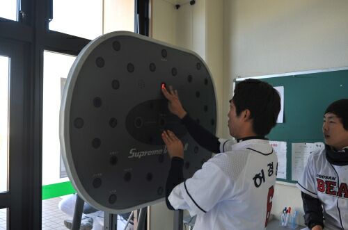 이 기계는 다름아닌 ‘동체시력훈련’용 장비다. 일반적으로 이야기하는 시력은 정지한 상태에서 시력판에 있는 숫자를 보는 능력을 나타내는 정지 시력인 반면, 동체시력은 움직이는 물체를 정확하고 빠르게 인지하는 능력을 나타낸다. 동체시력은 움직이는 속도가 빠를수록 떨어진다. 동체시력이 좋으면 상대방이나 물체의 움직임을 순간적으로 정확하게 포착할 수 있기 때문에 운동선수에게 특히 유리하다. 특히 강속구를 때려내야 하는 야구 선수 중 타자들에게는 동체시력이 좋아야하는 것은 필수요소다.