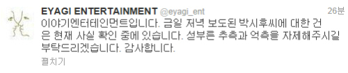 이야기엔터테인먼트 관계자는 18일 저녁 공식 트위터를 통해 “이야기엔터테인먼트입니다. 금일 저녁 보도된 박시후씨에 대한 건은 현재 사실 확인 중에 있습니다. 섣부른 추측과 억측을 자제해주시길 부탁드리겠습니다”라고 입장을 밝혔다.