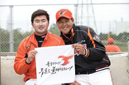| 한화 유창식(오른쪽)이 안승민과 함께 오키나와 전지훈련에서 팬들에게 인사하고 있다. |