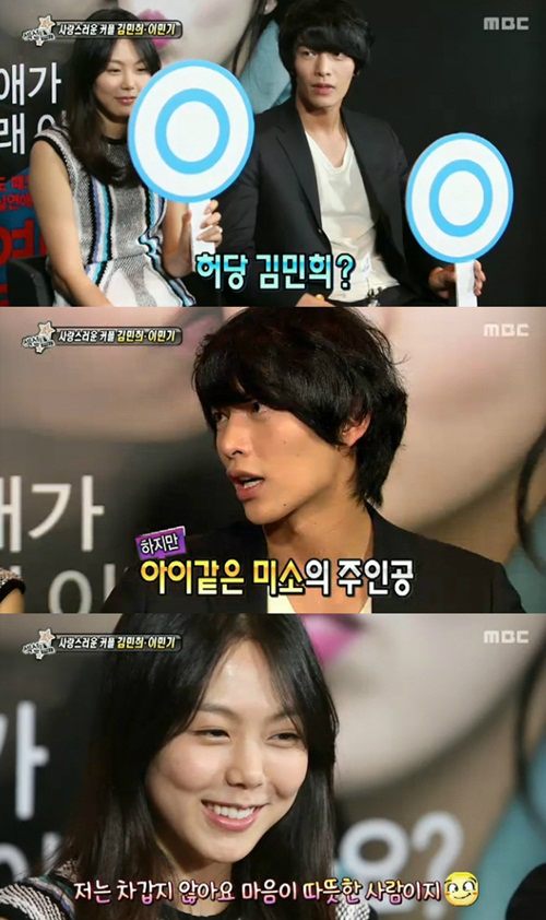 이날 '김민희는 알고보면 허당이다'라는 질문에 이민기는 "김민희 씨가 무표정일 땐 좀 차가워 보이는데, 원래는 아이같은 미소의 주인공이다"라고 말하며 긍정을 표시했다.