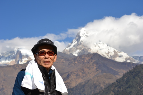 트레킹 중 히말라야 설봉을 배경으로 포즈를 취한 전래식 화백