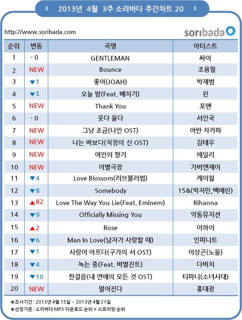 온라인 음원 서비스 업체 소리바다는 싸이의 ‘젠틀맨’이 4월3주차(4월 15일~4월 21일) 1위를 차지했다고 밝혔다. 싸이는 ‘젠틀맨’이 공개된 직후 빌보드 메인차트 HOT 100에서 12위로 진입, 영국 UK차트에서도 10위에 이름을 올렸다.