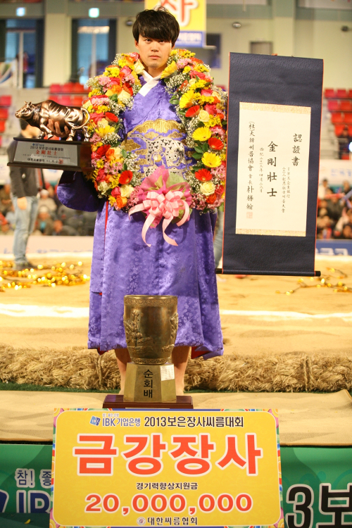 이승호는 26일 충북 보은국민체육센터에서 열린 IBK 기업은행 2013 보은장사씨름대회 금강장사 결정전(5전3승제)에서 임태혁을 3-1로 꺾고 환호했다. 이승호가 장사에 오른 것은 2008년 영동 체급별대회 거상장사(90㎏) 결정전 우승 이후 5년 만이다. 또한 지난 2월 전북 군산에서 열린 설날장사씨름대회 결승에서 신예 최정만(현대삼호중공업)에게 0-3으로 무릎을 꿇고 준우승에 그쳤던 아쉬움도 한번에 털어버렸다. 반면 2011년과 2012년 보은 대회 우승자인 임태혁은 대회 3연패 문턱을 넘지 못하며 1품(2위)에 만족해야 했다.